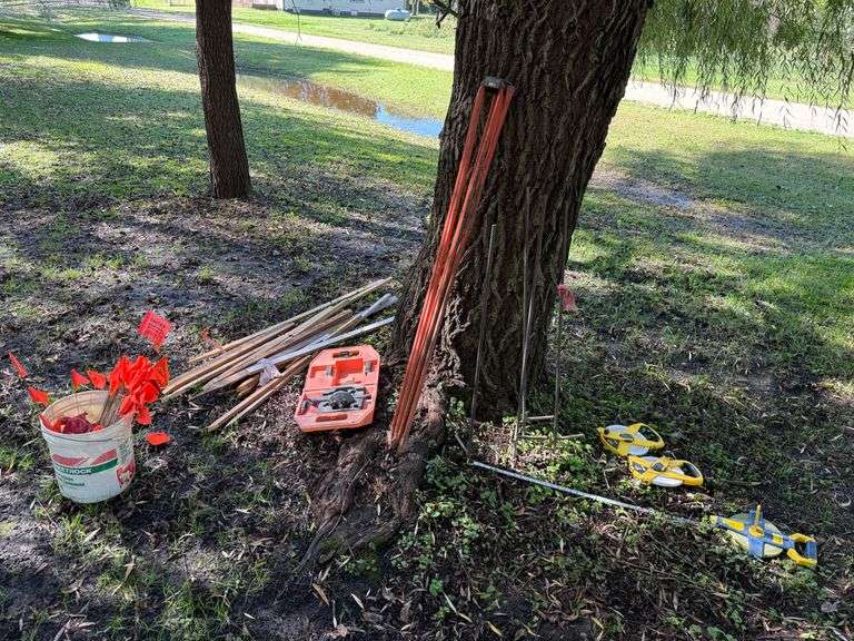 (3) 200’ Tapes, Some Pins, Flags, Stakes and Old Transit, Buying All for One Money